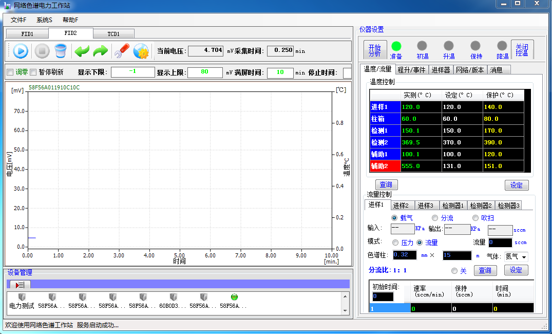 KDZD1189所內置有自動氣路控制裝置,在您電腦點火操作時自動放掉一部分空氣,使氫氣和空氣的配比達到適合點火的比例,并在自動完成點火后恢復這一比例;同樣,通過工作站軟件中的橋流設置窗口即可完成熱導橋流的設置