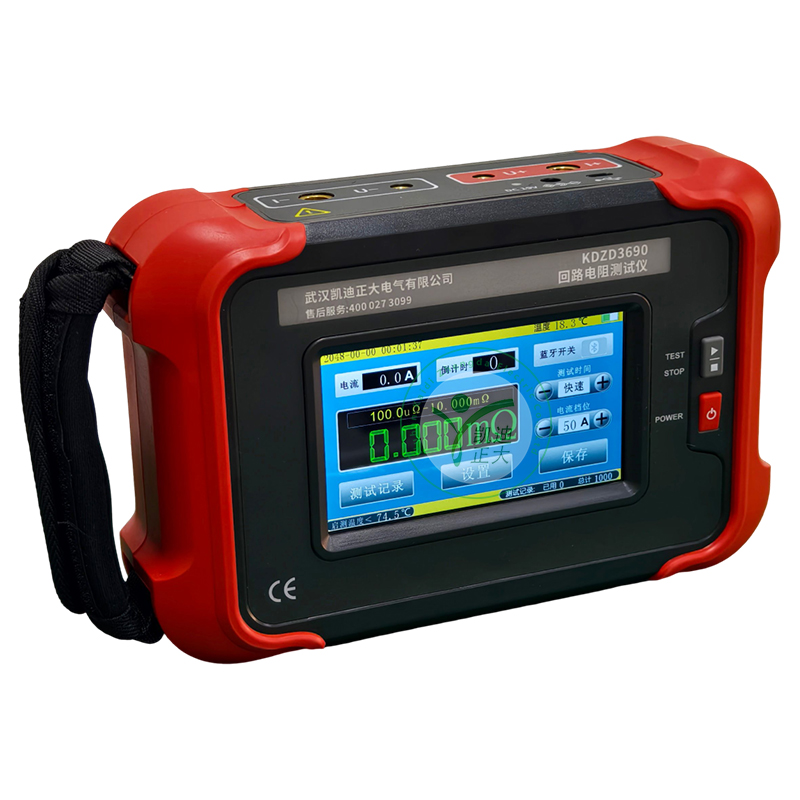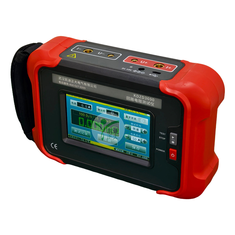 KDZD3690 手持式回路電阻測試儀根據人體工程學原理設計,手感舒適,特殊設計的機體結構具有絕緣、封閉,防漏電、防風沙,減震防護等功能。儀表采用高亮度5寸觸摸彩屏,操作簡易快速功能直達,字符清晰明亮,中英文顯示界面。儀表有多檔測試電流可選,儀表顯示當前檔位的測試范圍,用戶可自行選擇電流檔位及測試時間,滿足用戶不同場合的要求。