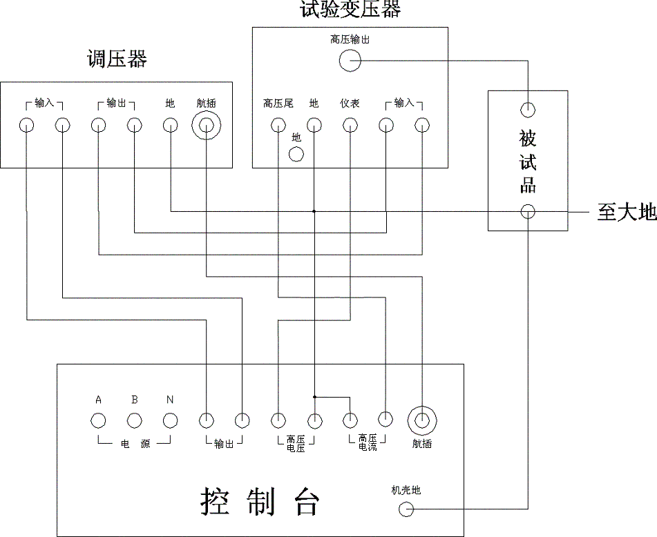 a) 按上圖所示將電源(兩相380V及零線)、TCWJH控制臺、調壓器、試驗變壓器、被試品及地線連接好,在聯結調壓器至TCWJH之間的航插時,特別注航插凸出槽和凹下槽對準,插進去再擰緊,千萬不要不論位置強行插,這樣很容易損壞航插。檢查無誤后再合上電源開關。合上電源開關后,電源指示綠燈(—HG)、零位指示黃燈(—HY)亮;如果零位指示燈不亮,則說明調壓器不在零位,此時可按“點動降壓”按鈕使調壓器降壓直至零位指示燈亮為止。
