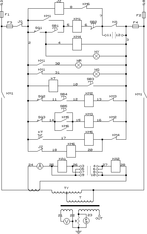 f)在升壓或耐壓過程中,如發生短路、閃絡擊穿等過流時,過流繼電器(-KA)動作,切斷主回路,調壓器自動回零,表示被試品不合格。需要指出的是在耐壓過程中出現過流的情況,調壓器自動回零的同時應及時按下“計時”按鈕切除過流繼電器。