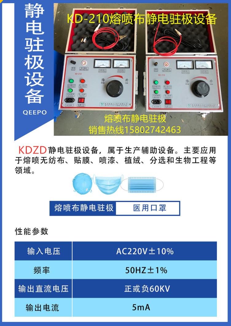 KDZD5020熔噴布靜電駐極設備參數: 高壓輸出:自動聲壓 恒壓輸出 安全措施:自動檢測電流變化,反折保護電路特性 輸入電壓:220VAC,50Hz 輸出電壓:DC 0-120KV,負極性,輸出功率:200W-30000W可以定制,輸出電流2mA-10000mA可以定制。可調故障處理:過電壓,過電流自動跳脫 適用環境:0-40攝氏度。