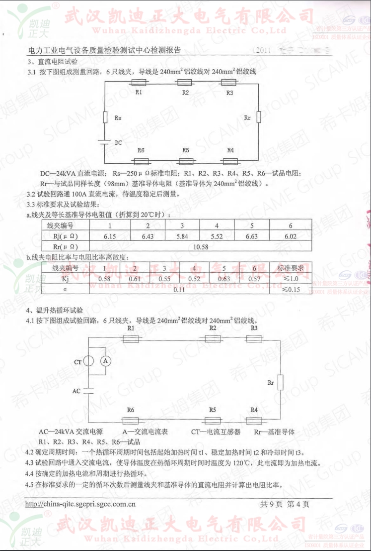 法國(guó)希卡姆集團(tuán)全資注冊(cè)的希瑪電力設(shè)備公司,2011年6月在武高所電力工業(yè)電氣設(shè)備質(zhì)量檢驗(yàn)測(cè)試中心檢定H型線夾。檢測(cè)結(jié)論:根據(jù)DL/T765.1-2001對(duì)希瑪電力設(shè)備送檢的HC650型H形線夾進(jìn)行了尺寸和外觀檢查,結(jié)構(gòu)和組裝檢查,直流電阻試驗(yàn)、溫升試驗(yàn)、熱循環(huán)試驗(yàn)、短路電流試驗(yàn)和握力試驗(yàn),檢測(cè)項(xiàng)目合格。