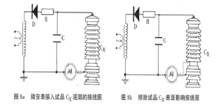 c.對(duì)氧化鋅、磁吹避雷器等試品接地端可拆開的情況下,也可采用在試品的底部(地電位側(cè))串入電流表進(jìn)行測(cè)量的方式。 當(dāng)要排除試品表面泄漏電流的影響,可用軟的裸銅線在試品地電位端繞上幾圈并與屏蔽線的屏蔽相聯(lián)接(見下圖)