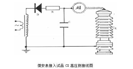 a.一般測(cè)量時(shí),當(dāng)便攜式直流高壓發(fā)生器接好線后,先把聯(lián)接試品的線懸空,升到試驗(yàn)電壓后讀取空試時(shí)的電暈和雜散電流I,然后接上試品升到試驗(yàn)電壓讀取總電流Ⅰ1;試品泄漏電流:Io =Ⅰ1—I’ b.當(dāng)需要精確測(cè)量被試品泄漏電流時(shí),則應(yīng)在高壓側(cè)串入高壓微安表(見下圖)