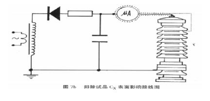 b.微安表須有金屬屏蔽,應(yīng)采用屏蔽線與試品聯(lián)接。高壓引線的屏蔽引出應(yīng)與儀表端的屏蔽緊密聯(lián)接。如果試品表面污穢要排除試品表面泄漏電流的影響可在試品高電位端用裸金屬軟線緊密繞幾圈后與高壓引線的屏蔽相聯(lián)接(見下圖)。