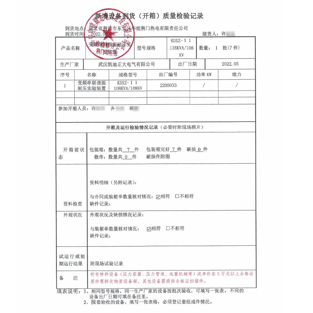 2022年6月初,華能荊門(mén)熱電有限公司采購(gòu)凱迪正大電氣一批熱電廠電氣試驗(yàn)設(shè)備,其中KDXZ-135kvA/108kV變頻串聯(lián)諧振耐壓試驗(yàn)裝置已經(jīng)順利到貨,實(shí)發(fā)數(shù)量7件,實(shí)收數(shù)量7件。由中國(guó)電建湖北運(yùn)維檢修公司荊門(mén)項(xiàng)目部許工負(fù)責(zé)驗(yàn)收,火紅的電抗器顏色格外顯眼。許工和齊工一起對(duì)設(shè)備進(jìn)行清點(diǎn),仔細(xì)對(duì)比了湖北省計(jì)量院出具的計(jì)量檢測(cè)報(bào)告,對(duì)比現(xiàn)場(chǎng)升壓試驗(yàn)精度,表示認(rèn)可滿(mǎn)意。