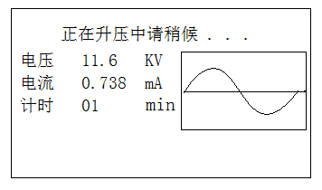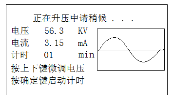 按退出鍵顯示20組歷史數(shù)據(jù),將光標(biāo)移到“啟動試驗電壓”按確定鍵,儀器進(jìn)入圖6所示的升壓界面。