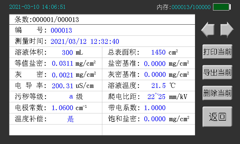 鹽密基準值:在測量頁點“校準”按鈕后會自動保存溶液的初始鹽密值作為“鹽密基準值”,也可以用戶自定義。