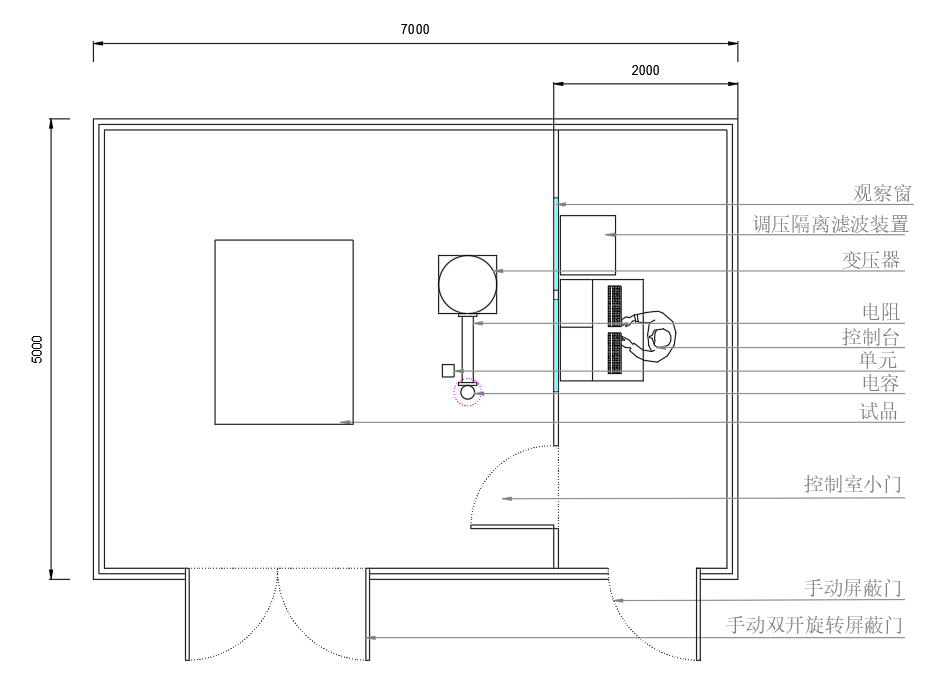>  屏蔽室整體尺寸:長7米×寬5米×高3米