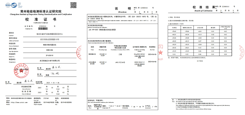 2025年1月3日,武漢凱迪正大電氣有限公司的KDWS-28A精密冷鏡式露點(diǎn)儀,成功通過(guò)了常州檢驗(yàn)檢測(cè)標(biāo)準(zhǔn)認(rèn)證研究院的嚴(yán)格校準(zhǔn),并榮獲校準(zhǔn)證書(shū),標(biāo)志著該產(chǎn)品在工業(yè)氣體微水測(cè)量的可靠和精準(zhǔn)性。