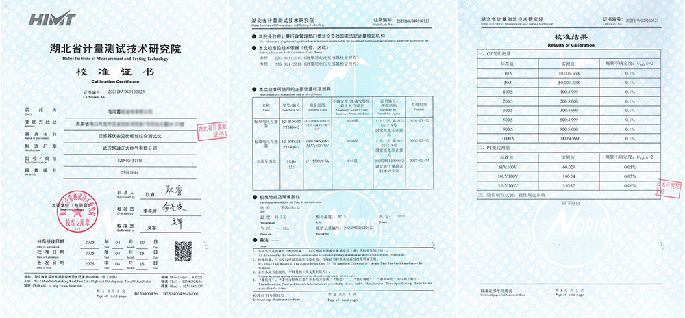 近日,海南某發電有限公司采購武漢凱迪正大的兩套KDHG-518B互感器伏安變比極性綜合測試儀,均成功通過了湖北省計量測試技術研究院的嚴格校準,并順利取得校準證書。