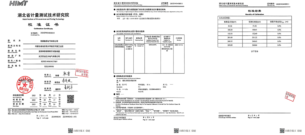 本次校準由湖北省計量測試技術研究院執行,該校是政府依法設立的法定計量檢定機構,具備國家認可的校準資質與溯源能力。校準過程嚴格依據JJF(浙)1144-2018《交流高壓試驗裝置校準規范》進行,確保了技術方法的規范性與結果的可比性。
